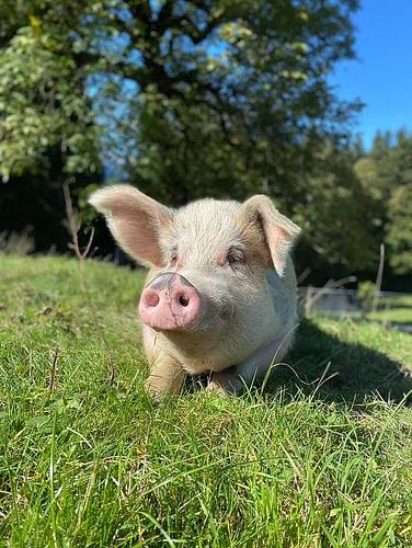 Massif et espiègle, il est "l'enfant terrible" de la famille, avec son tempérament explosif lorsqu'il s'agit de nourriture. Mais sa confiance en nous implique aussi du respect, qu'il voue à Virginia comme si elle était sa mère. Adopté par la famille des cochons nains du sanctuaire, il est devenu un frère comme un autre (à quelques centaines de kilos près !).