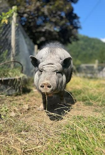 Gingko est une truie hypersensible, et son vécu l'a beaucoup affectée : psychologiquement, émotionnellement et physiquement. Malgré cela, depuis son arrivée à Co&xister, elle retrouve peu à peu de la joie de vivre, et alors qu'elle avait le regard complètement éteint lorsque nous l'avons accueillie, peu à peu, nous la voyons retrouver l'étincelle qu'elle avait perdue.